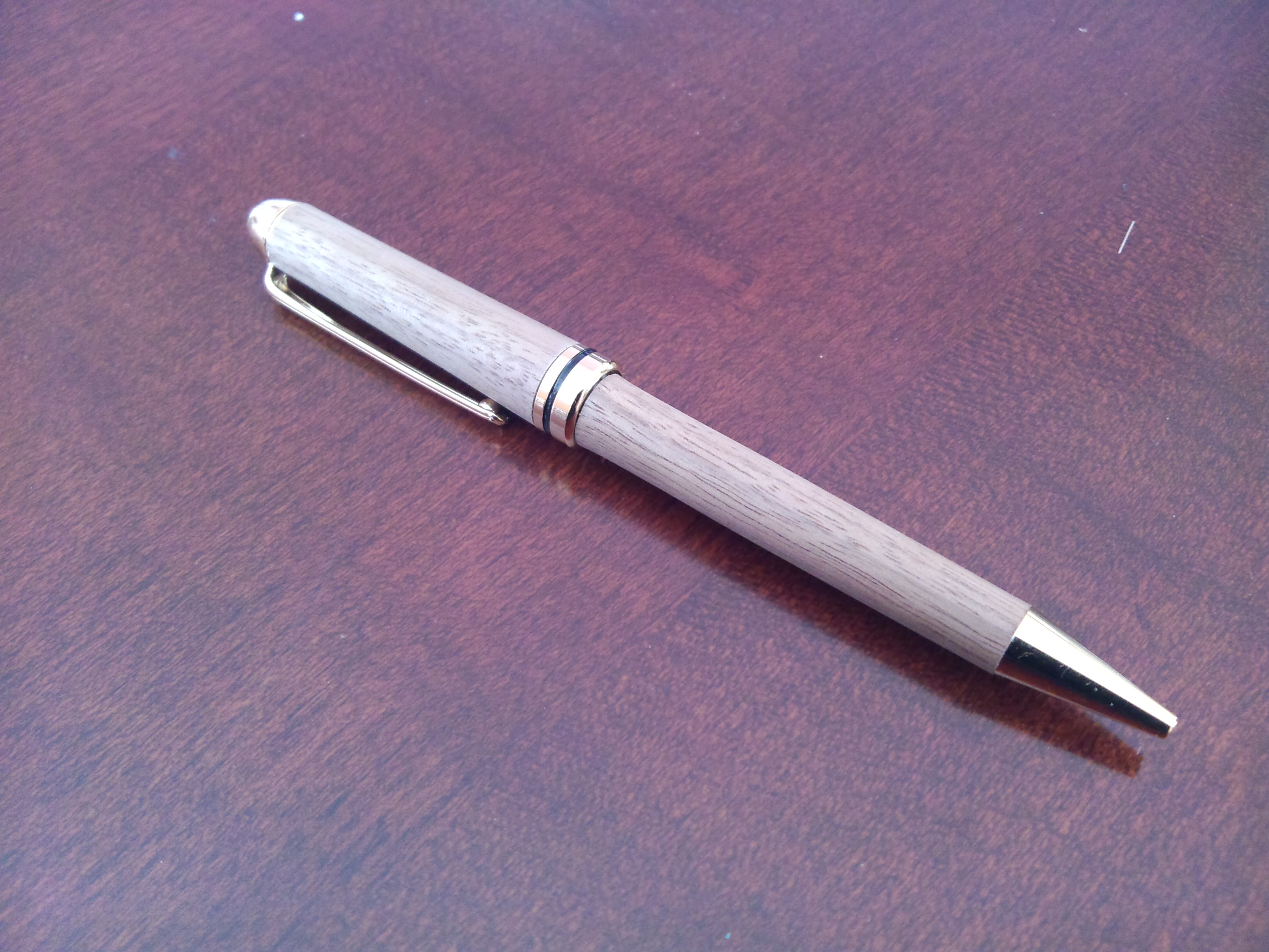 A colleague of mine, whose wife is a professional woodworker, brought me in some bits of nice wood last week. Some Oak, and Cherry and, what I think is Walnut. The strip of Walnut looked really nice so I turned this pen from some of that. It was quite soft (in terms of hardwood) but turned really nicely, although finishing was kind of challenging. It has very little figure in it and is quite plain. I am also surprised at the light colour of the finished pen. I’m not sure what I would call it, because there is a slight hue of purple in it. All-in-all I am looking forward to using some of the other wood that Dean and Bonnie gave me. Thanks guys.