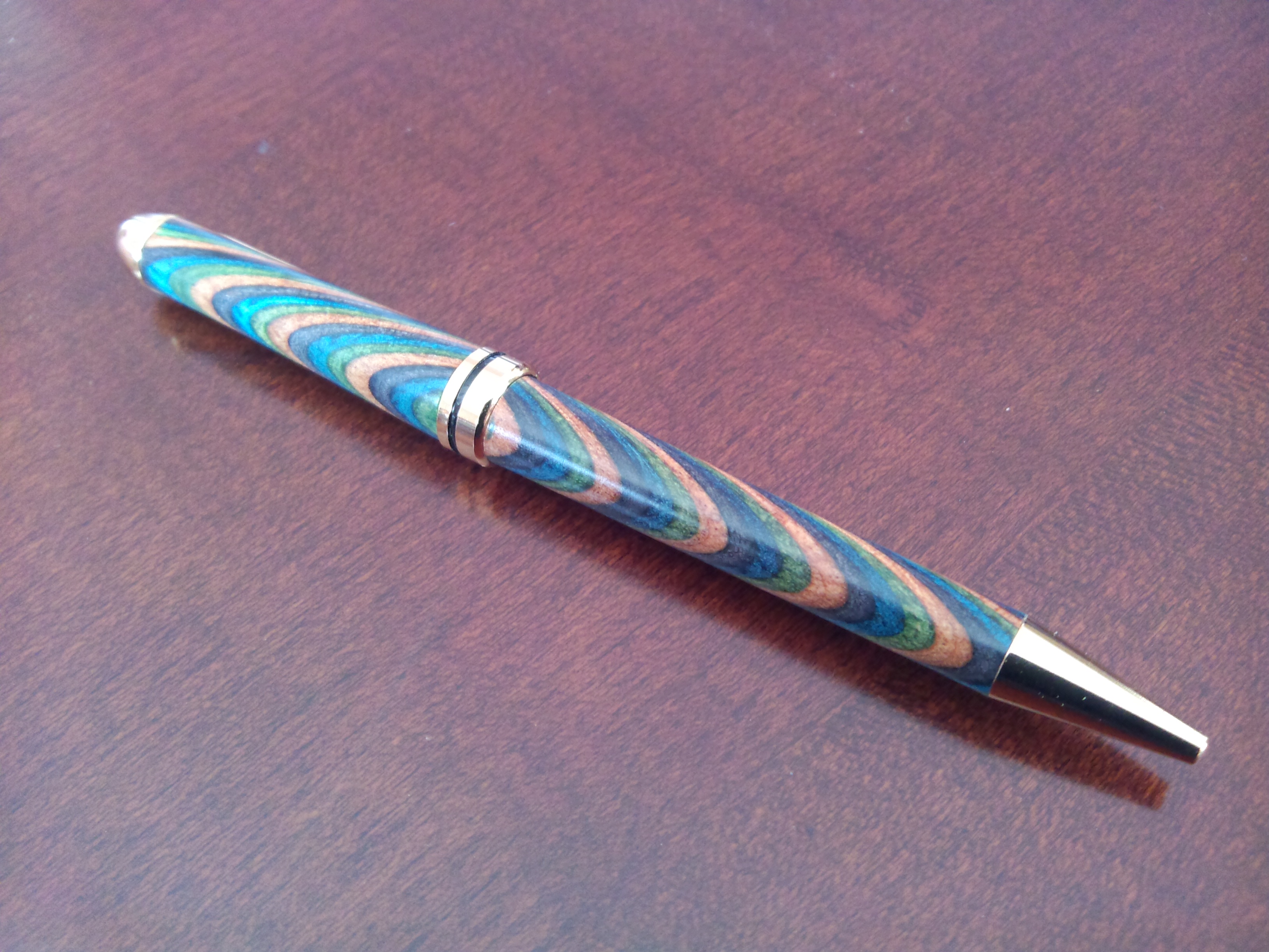 Jennifer and her Mother gave me, in my stocking for Christmas, a few pen blanks, in anticipation of my new career starting. One of the blanks was a piece of Dymondwood called Field and Stream. It is basically a bunch of layers of wood laminated like plywood, but the layers are dyed and the blanks have been stabilized with resin (acrylic?). Because of the angle of the lamination, I was squaring the blank and was a little too aggressive and the blank broke. I had to try turning Dymondwood so I used this as an excuse to spend more money at Lee Valley. I think I should get a part time job there just so I can feed this habit. At any rate, I was more gentle with this blank and it turned into a pen quite nicely. Because of the resin, it does smell a bit when turning and it doesn’t seem to come of in shavings like solid wood does (unless I wasn’t turning fast enough?). It basically chips off, but the finishing is nice and easy because of the resins. I think I will try my Micro-mesh pads to finish the next one I do.