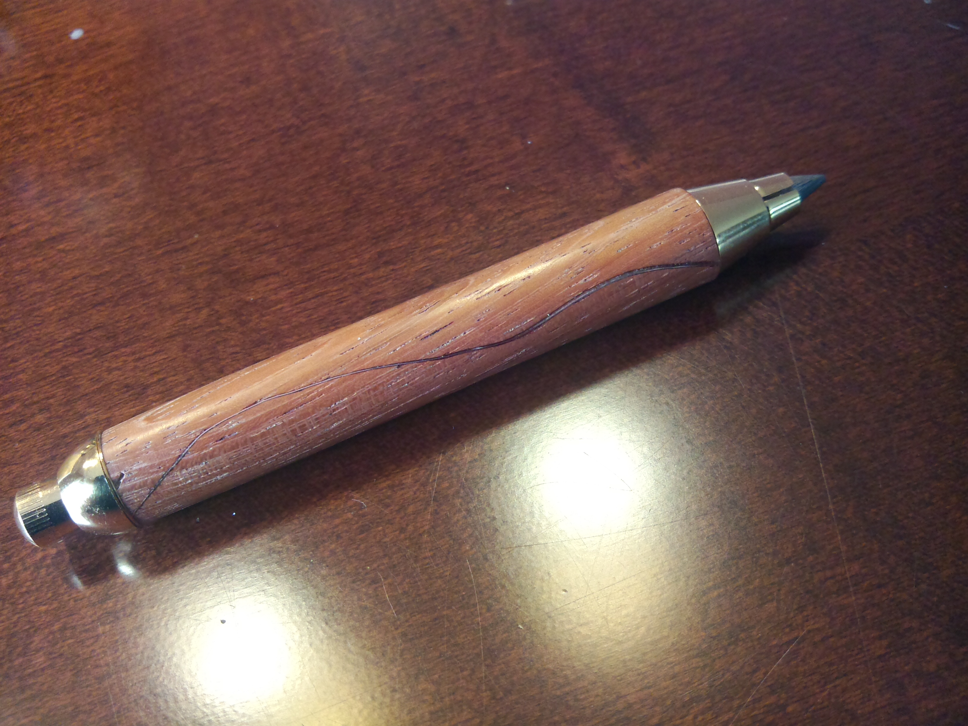 This evening, I took the pencil apart and rebuilt it. In the correct ends, the pieces are nice and flush with the wood. I had to take a large drill bit and a ball pien hammer to get the pieces out, but it was worth the effort.