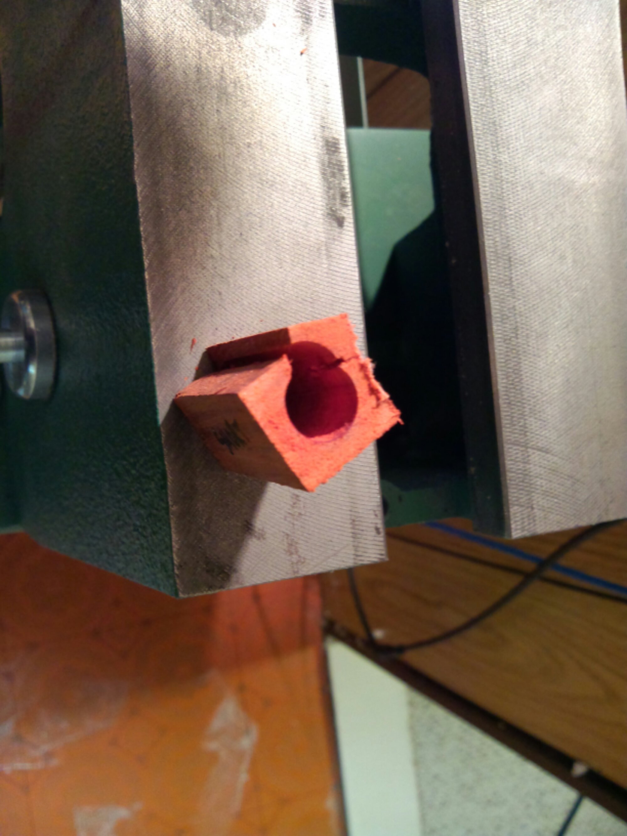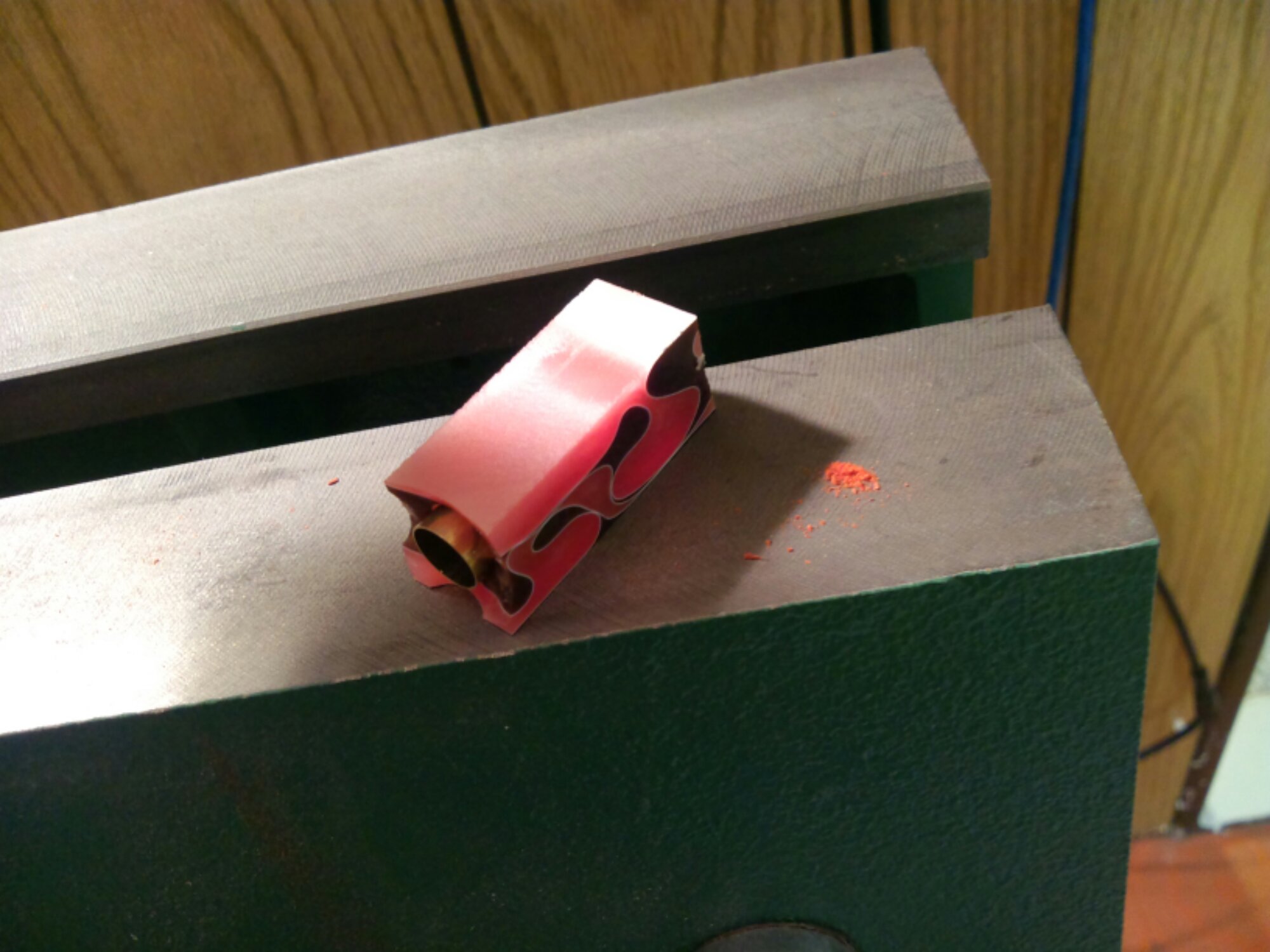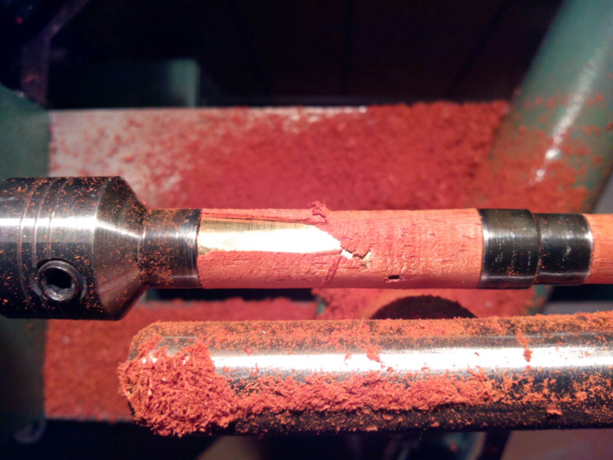 I started a couple of pens last night for a couple of friends visiting from BC. The first was a Fountain pen in a “Cinnamon Swirl” acrylic. Unfortunately just as I was closing in on drilling through the blank, it blew out the bottom. Because it was my last Cinnamon Swirl blank, I had to re-think my plan. My friend Ray is a wood carver and so I knew that his pen was going to be a wooden pen. I decided that I would make both of these pens out of Padauk. Well, I started drilling the first blank and the whole blank split beyond repair. I was able to get another blank (padauk) on the lathe but then it blew out just as I was nearing the end of the turning. Having run out of pen blanks and tubes I had to stop for the night. It is the most trouble I have ever had turning pens.