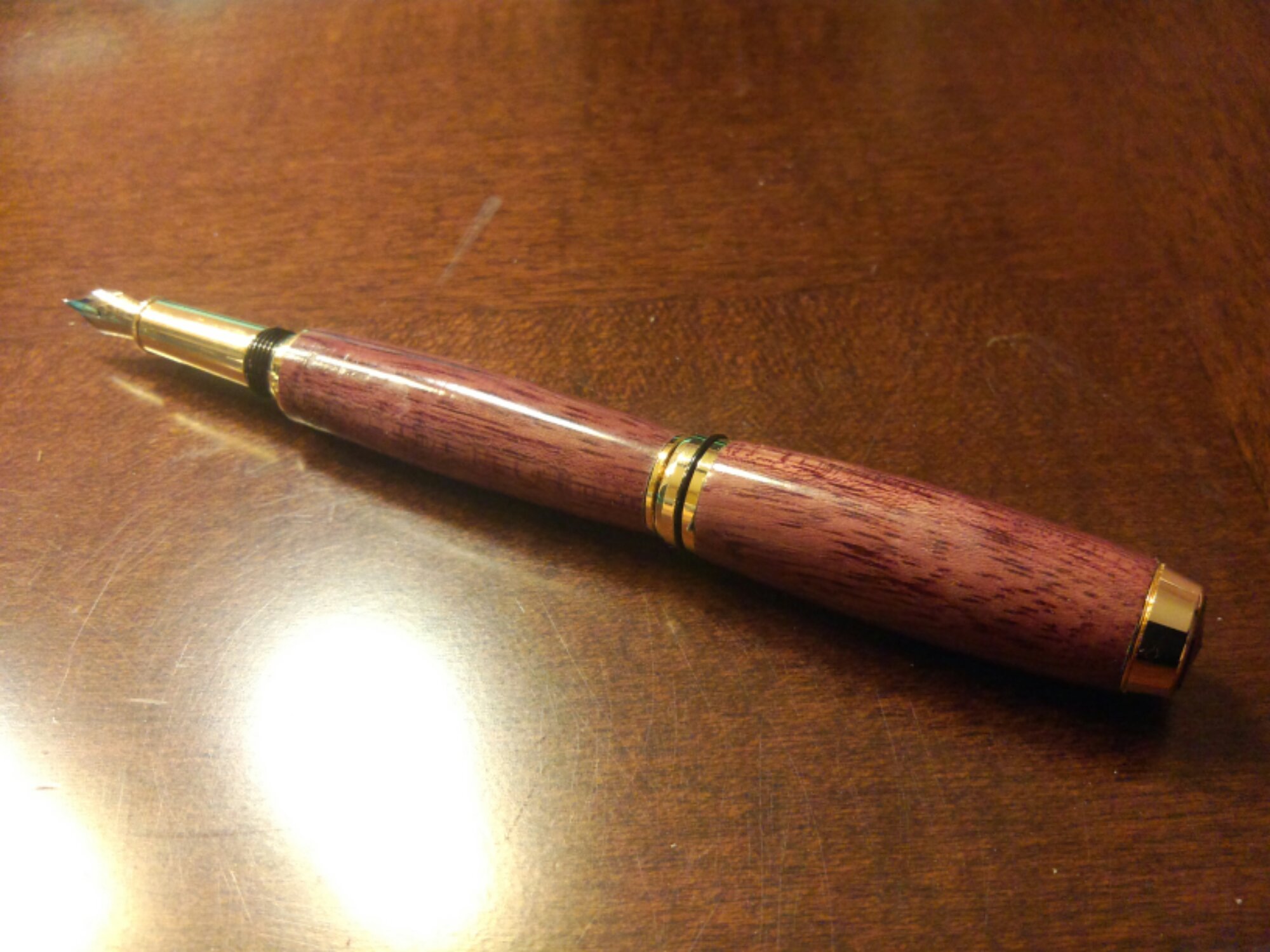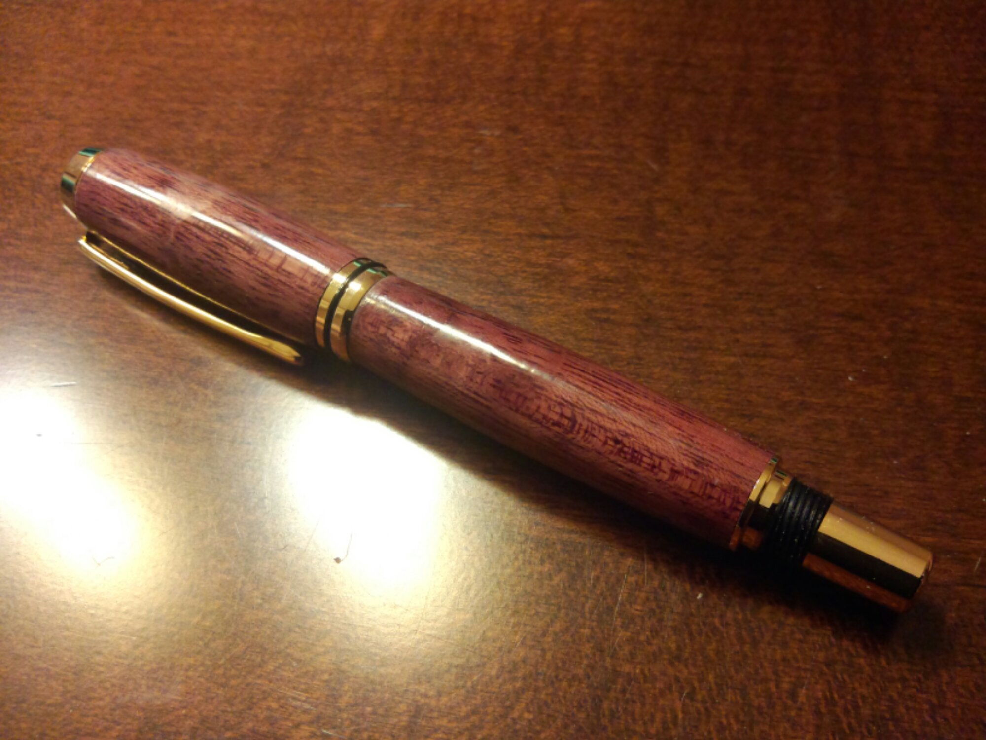 I have been planning to use my last Baron fountain pen kit to replace the first fountain pen that I made in my class. The lid keeps coming off that one and so I need a new one for the office. I had planned to make it with an acrylic called stonewash denim, but I got carried away when turning and reduced the acrylic right down to the brass tube. This morning I decided to use a purpleheart blank and experiment some more with Cyanoacrylate glue (superglue) as a finish. My last experiments didn’t work out very well.