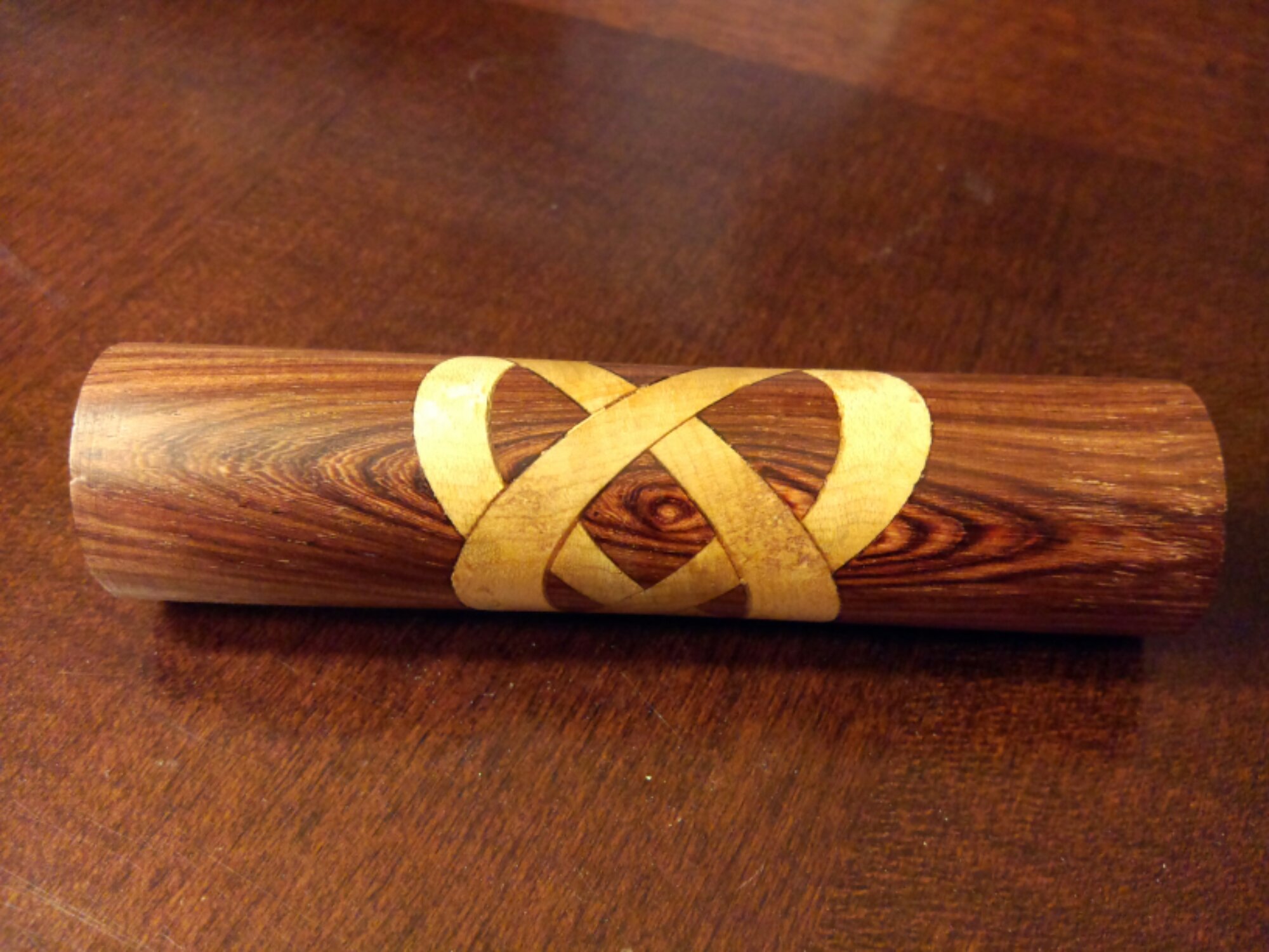 This morning I was going to continue with the pencil, but I realized that I had some alignment problems with the blank and, instead of wasting a pen tube on this experiment, I decided to chuck it between spur centres and turn it to see if I figured the geometry correctly. As you can see, it turned out very well, even though not every “string” of the knot lines up correctly. I was pretty impressed because I did all the cutting with a handsaw.