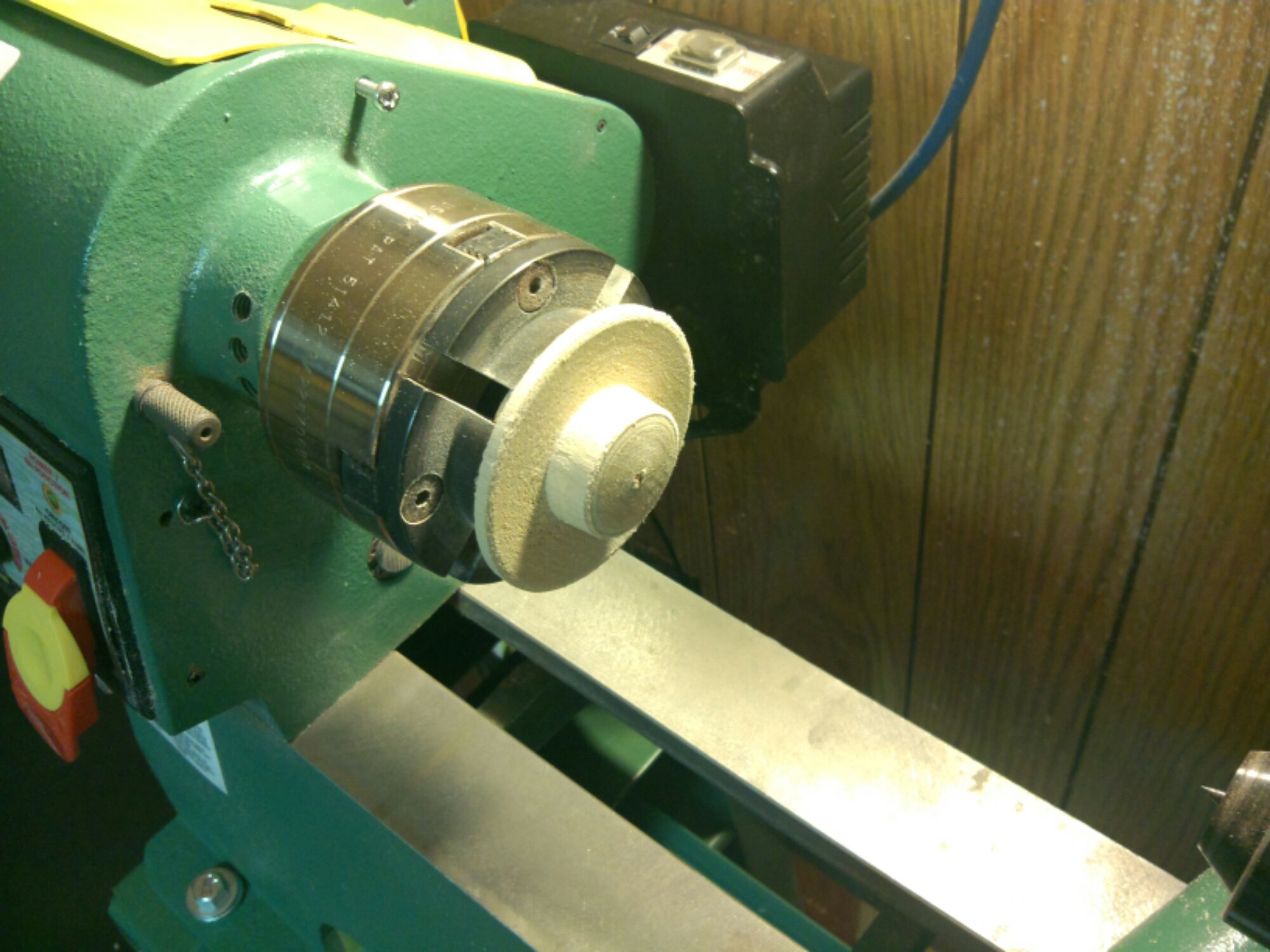 I had to utilize some of my own puny brainpower to do them but learned a few new techniques. I watched Alan’s video before I started but several points were not clear, so I just started and adapted as I went along. The first thing I did was true up a piece of Maple between centres and turned a tenon so that I could chuck it in the scroll chuck. Before I chucked it up, I drilled two holes for the pins on the bottom of the light. I didn’t quite get them centred on either side of the centre, but I don’t really notice. Next, I chucked it in my Talon and turned another tenon on the other end. This was somewhat pointless as I could have used the first tenon as the top, but wasn’t thinking clearly. Once chucked on the Talon, I cut the recess in piece for the magnet that attaches to the bottom. Then I had to drill a larger hole to countersink the screw and washer on the end of the posts so that I could actually attach the magnet. Then I flipped the piece over to shape the top. In Alan’s video, he used longneck (?) jaws in his chuck to expand into the magnet recess. My magnet was too small to have my jaws do that, so I made my first jamchuck (below) that held the piece in place while I was finishing the top.