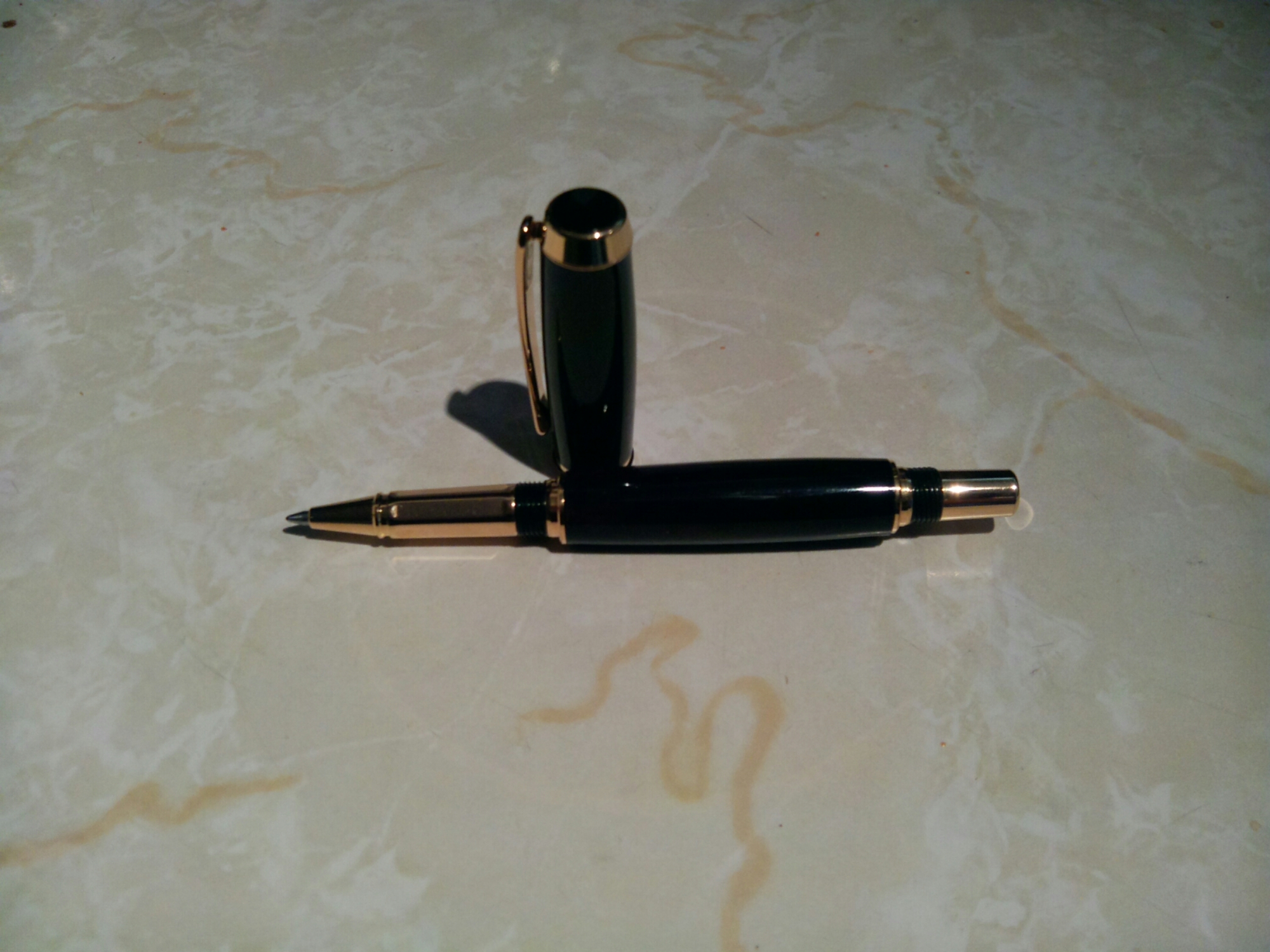 When I took my pen-turning class eighteen months ago, the store wouldn’t let us use Ebony for any of our class pens. I wasn’t sure why, but I assumed it was because of the hardness of the wood. I have deliberately avoided it in the ensuing months. Well, after I figured out my CA (cyanoacrylate or Super Glue) finishing technique, I decided that I would give ebony a try. I have always really liked the elegance of a nice shiny black pen. I decided that the Baron was an excellent kit as well and I had another Rollerball kit left after making the Chechen pen.