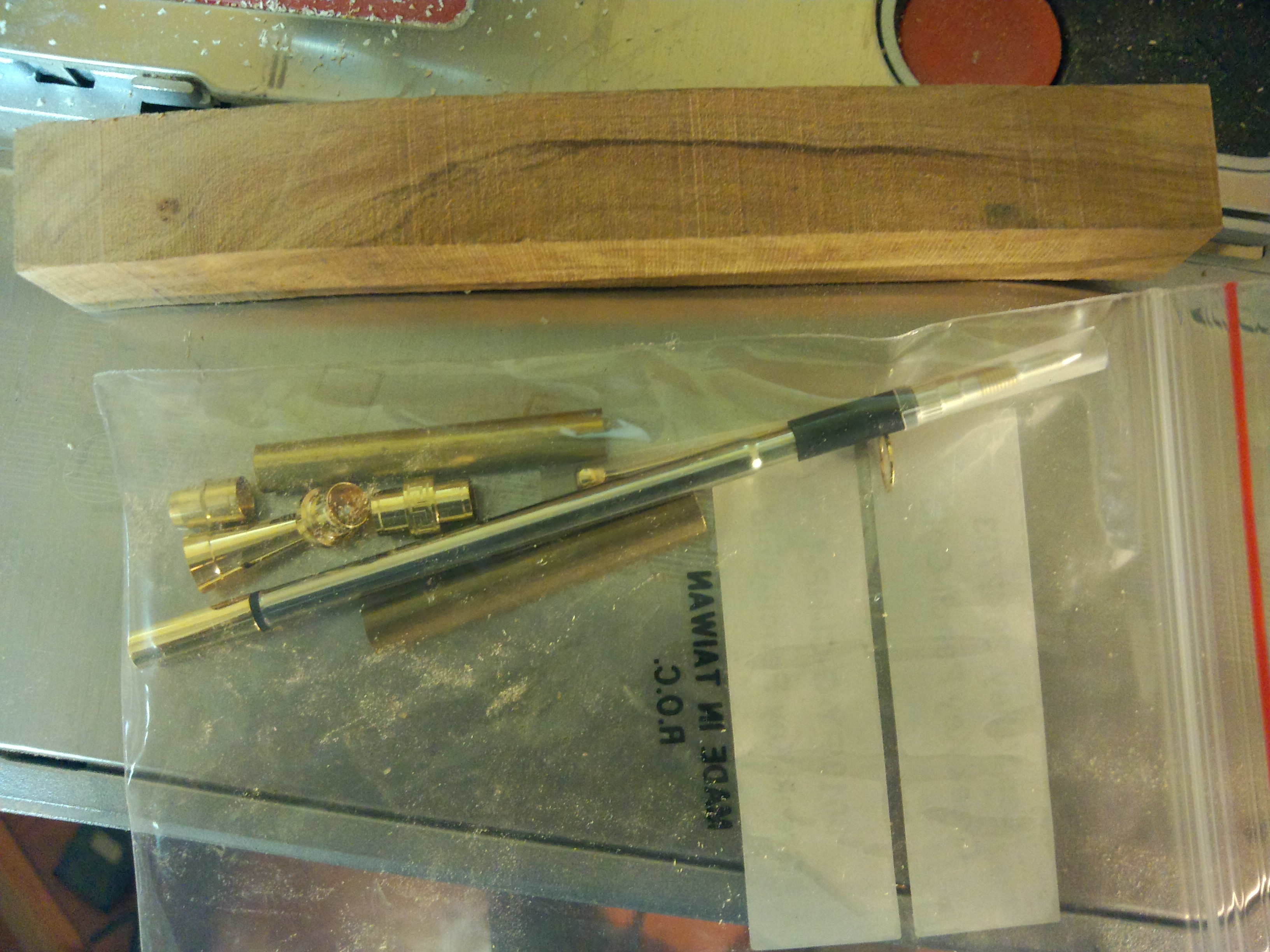The first step in making a pen is to have a kit. In Winnipeg, there is only 1 place to buy pen and pencil kits and that is my favourite store (Lee Valley). There are several mail-order options, but often, I don’t plan well enough ahead to order from my other favourite (William Wood-write – http://www.penblanks.ca). The kits come with all of the metal/brass parts of the pen. Each pen or pencil kit has a different set of parts that are pressed together after turning and finishing to make a functioning pen.