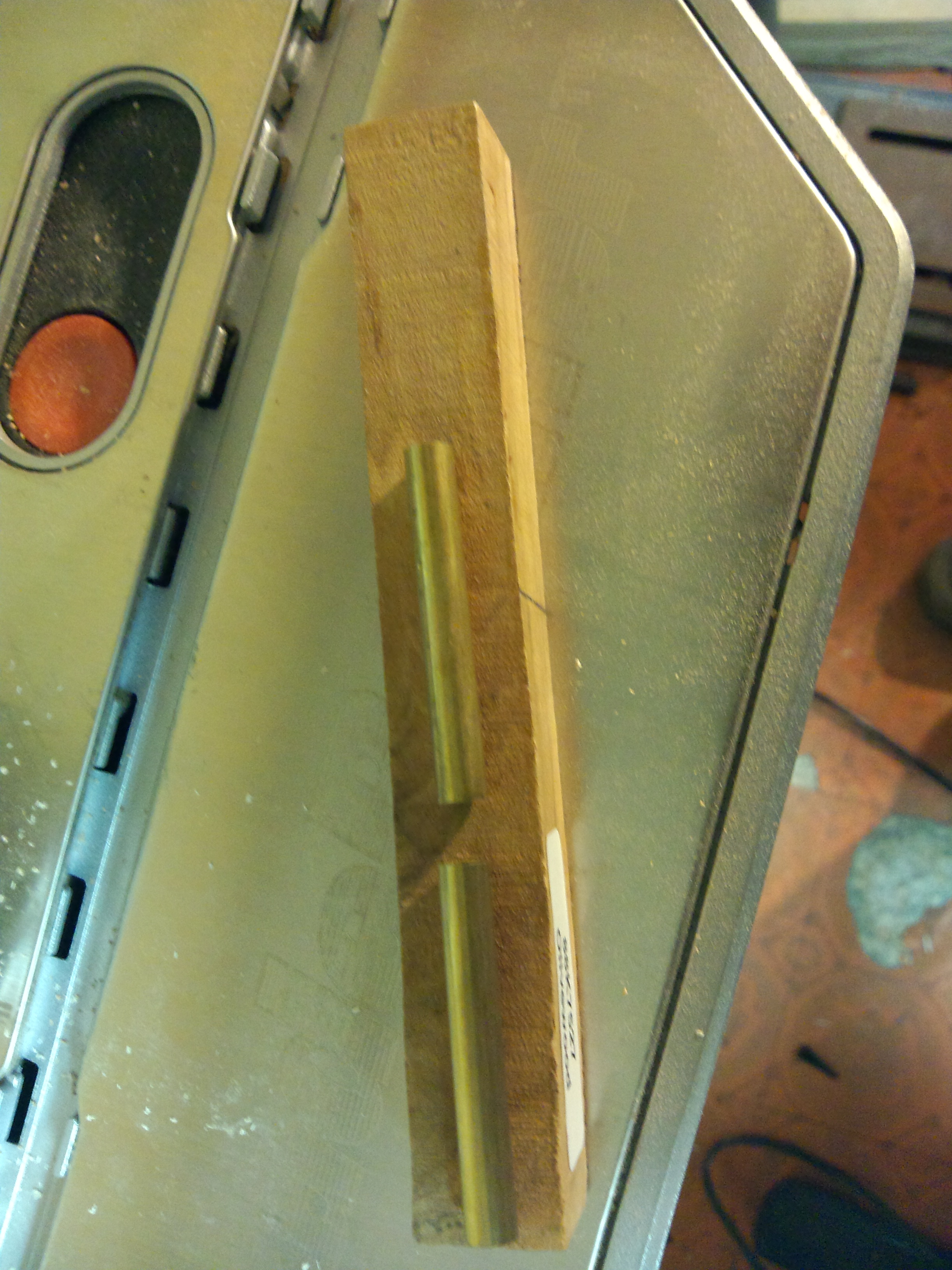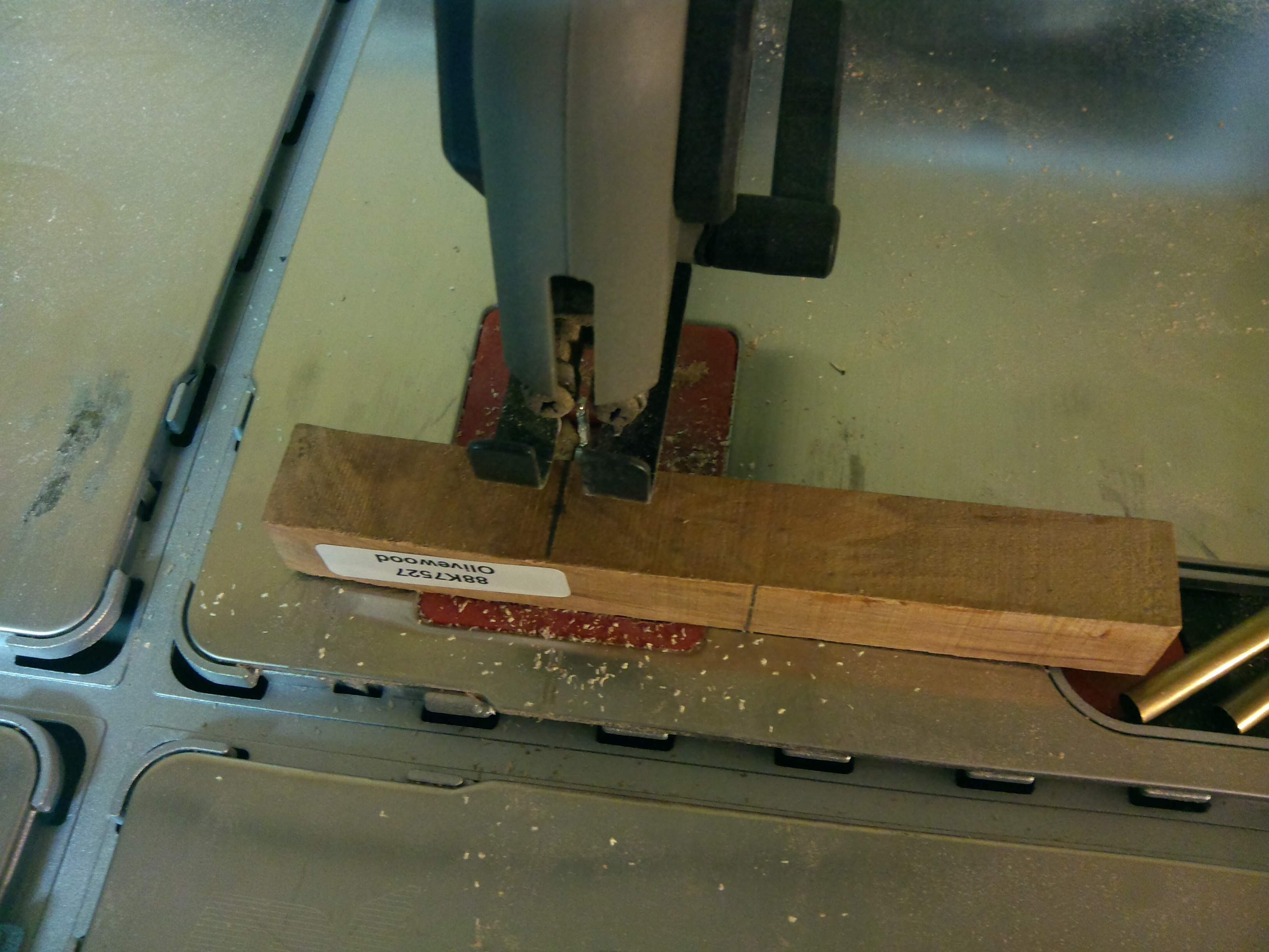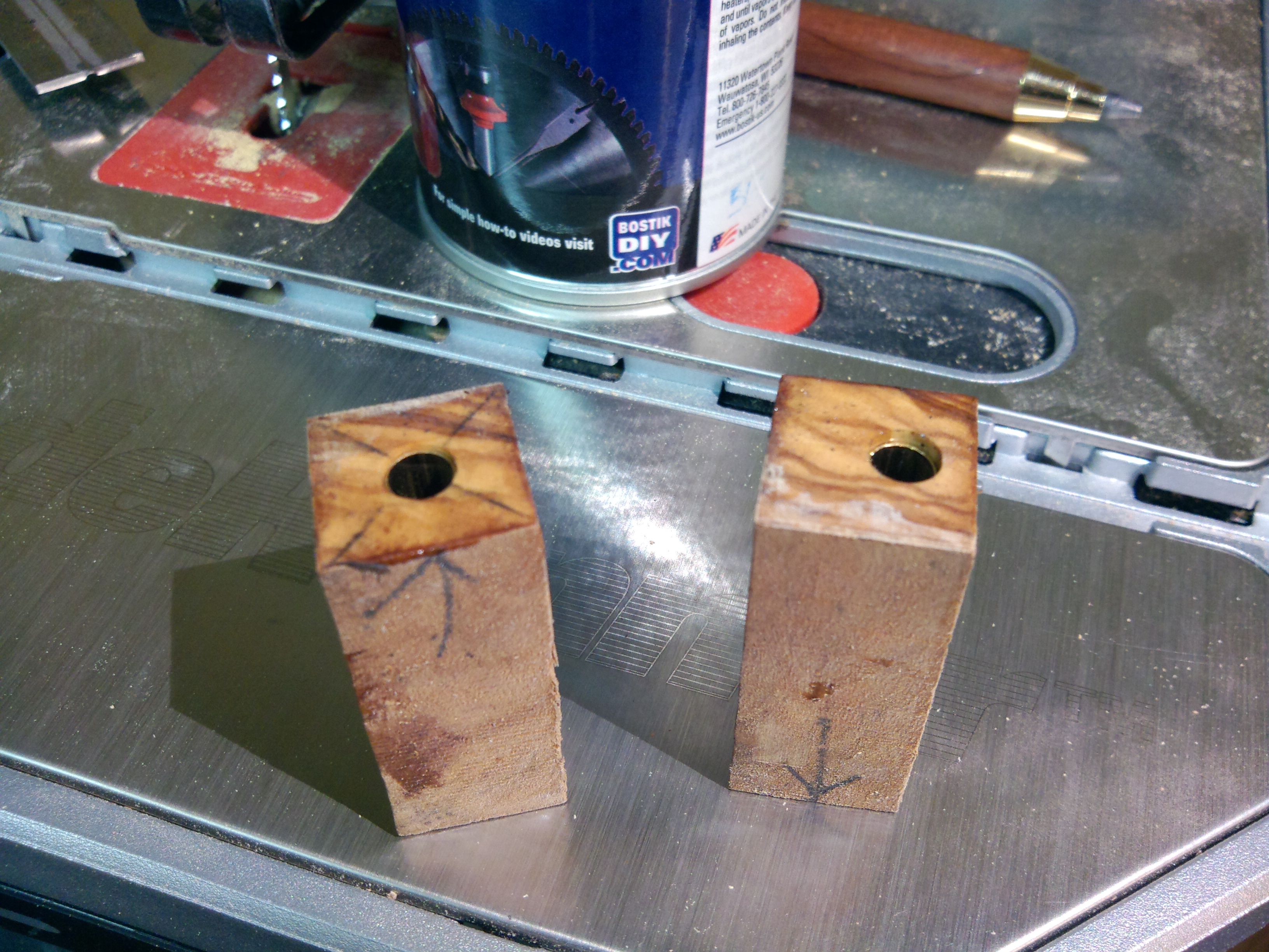 The bit of the blank that is untouched by the cutter will come off in the turning. Not picture here, is the mandrel that the blanks go on. There are bushings that are milled to the pen kit pieces, that these pieces will be turned down to. The kit instructions determine how the blanks go on the mandrel, but I am careful to place them on in the correct orientation (i.e. align the arrows).