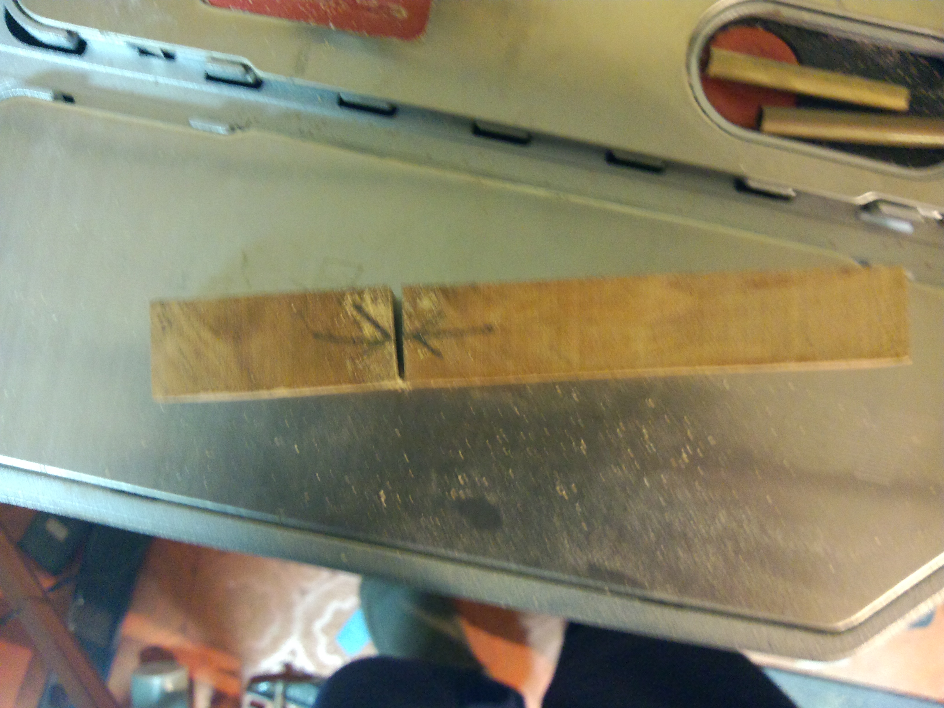 Once the two halves are cut you need to mark the centre of the ends for drilling. The way to find a centre in a square is quite simple. Draw lines from corner to corner each way. The intersection of lines is the centre. In a piece this small it is not overly critical to be precise, in terms of balance on the lathe. It is important though that if you miss the centre in the drill press by too much you run the risk of the bit wandering out the side of the blank. When drilling very hard woods, the drill bit will wander a bit.
