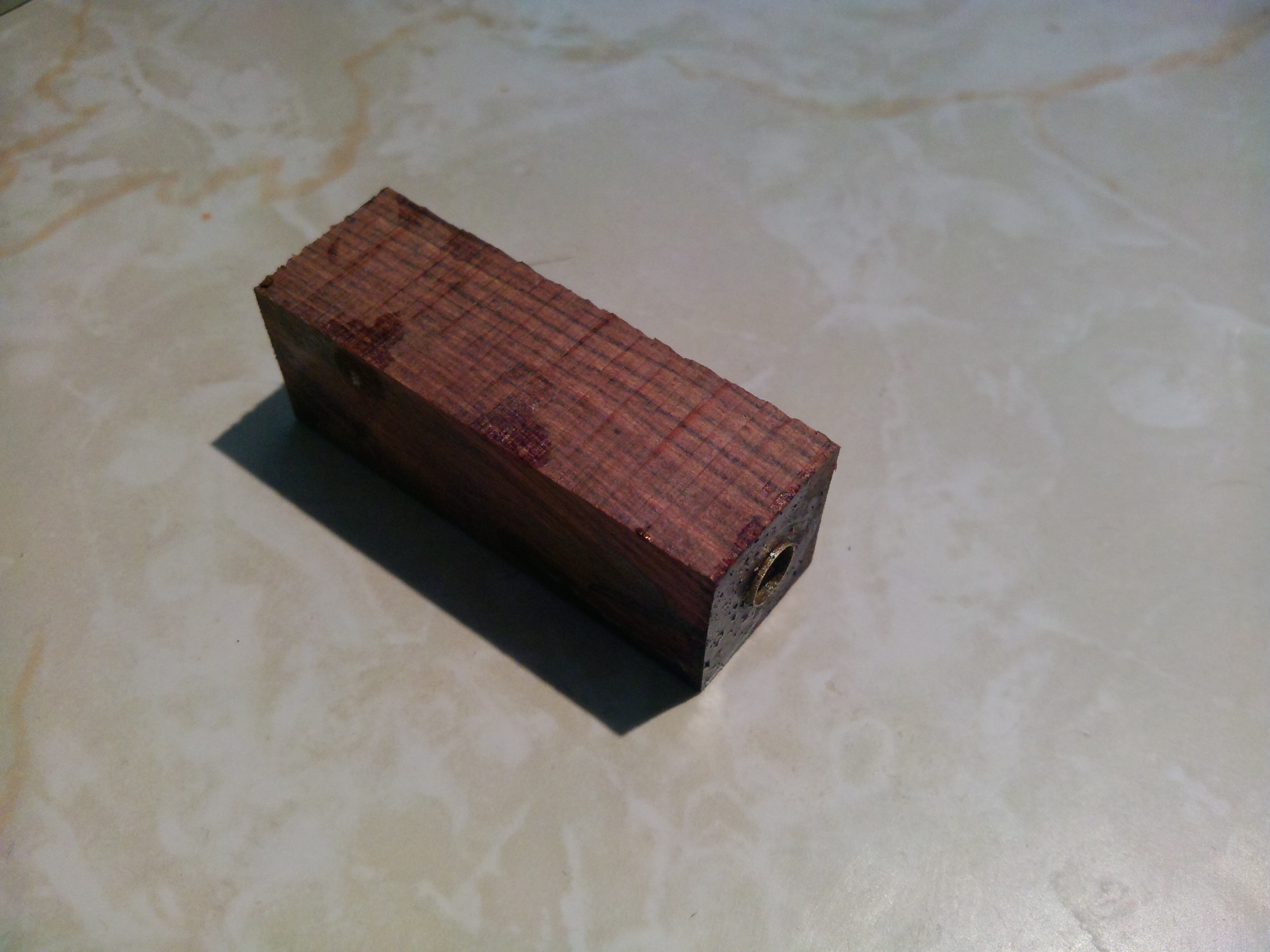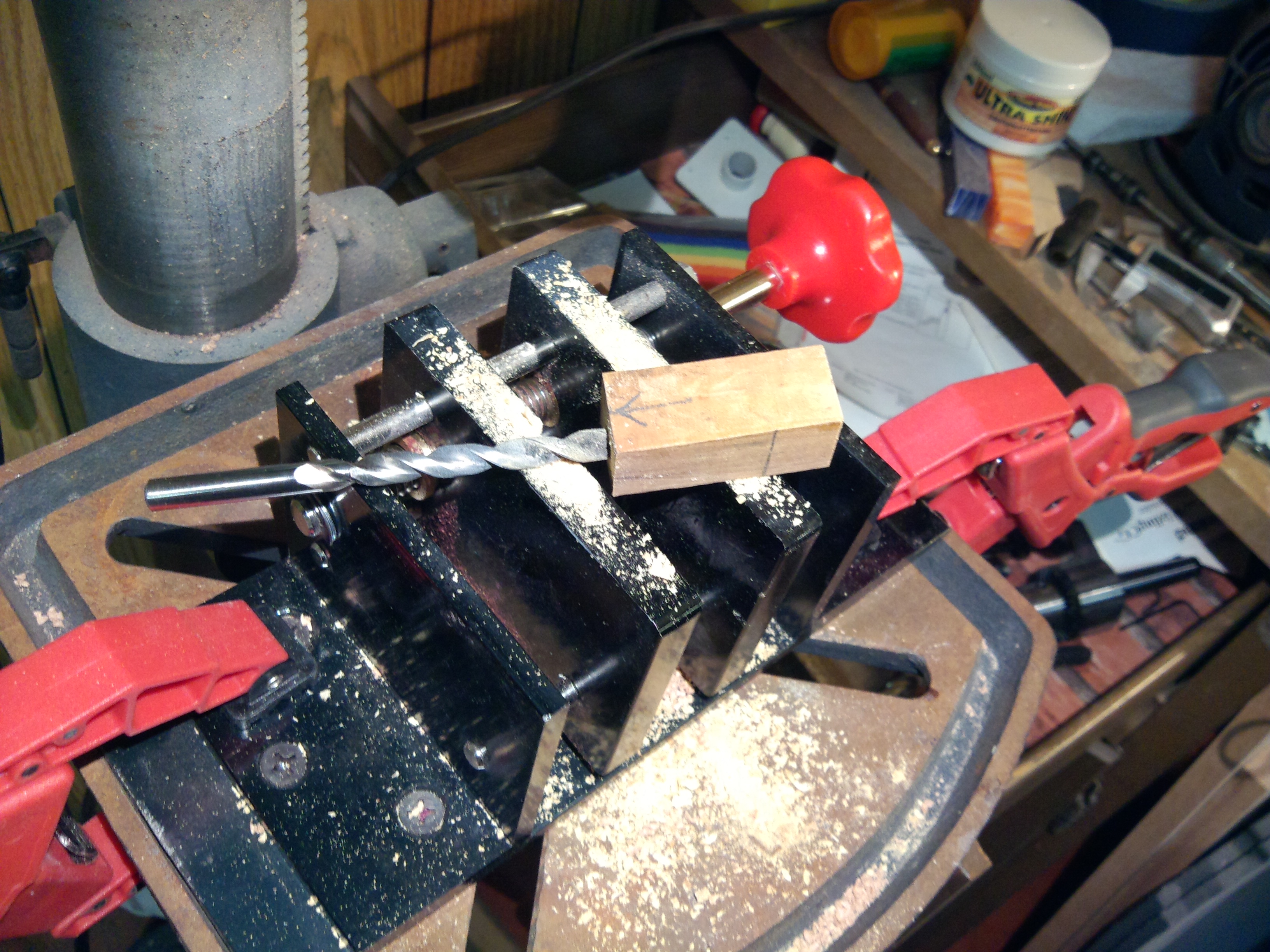 You can see in the next picture just how much the drill bit wanders in this Chechen. If I offset the bit in the top, it would wander too close to the edge of the blank to be of any use.