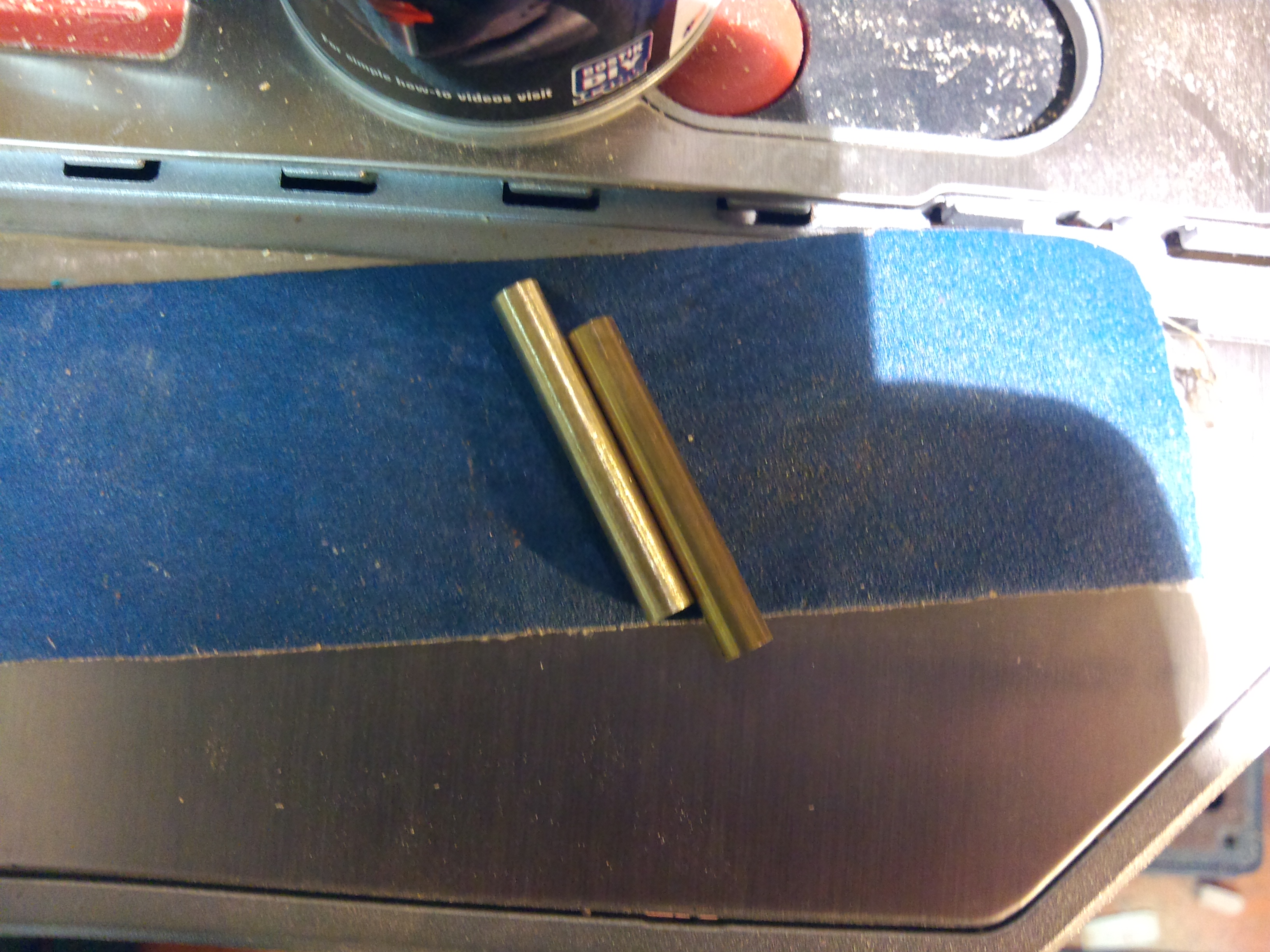 After the two halves are drilled it is time to prepare the tubes for gluing. The brass tubes are very smooth and if you attempt to glue them directly to the smooth wood, the bond will not be at all strong. Taking sandpaper to the tube will give the glue something to adhere to in the blank.