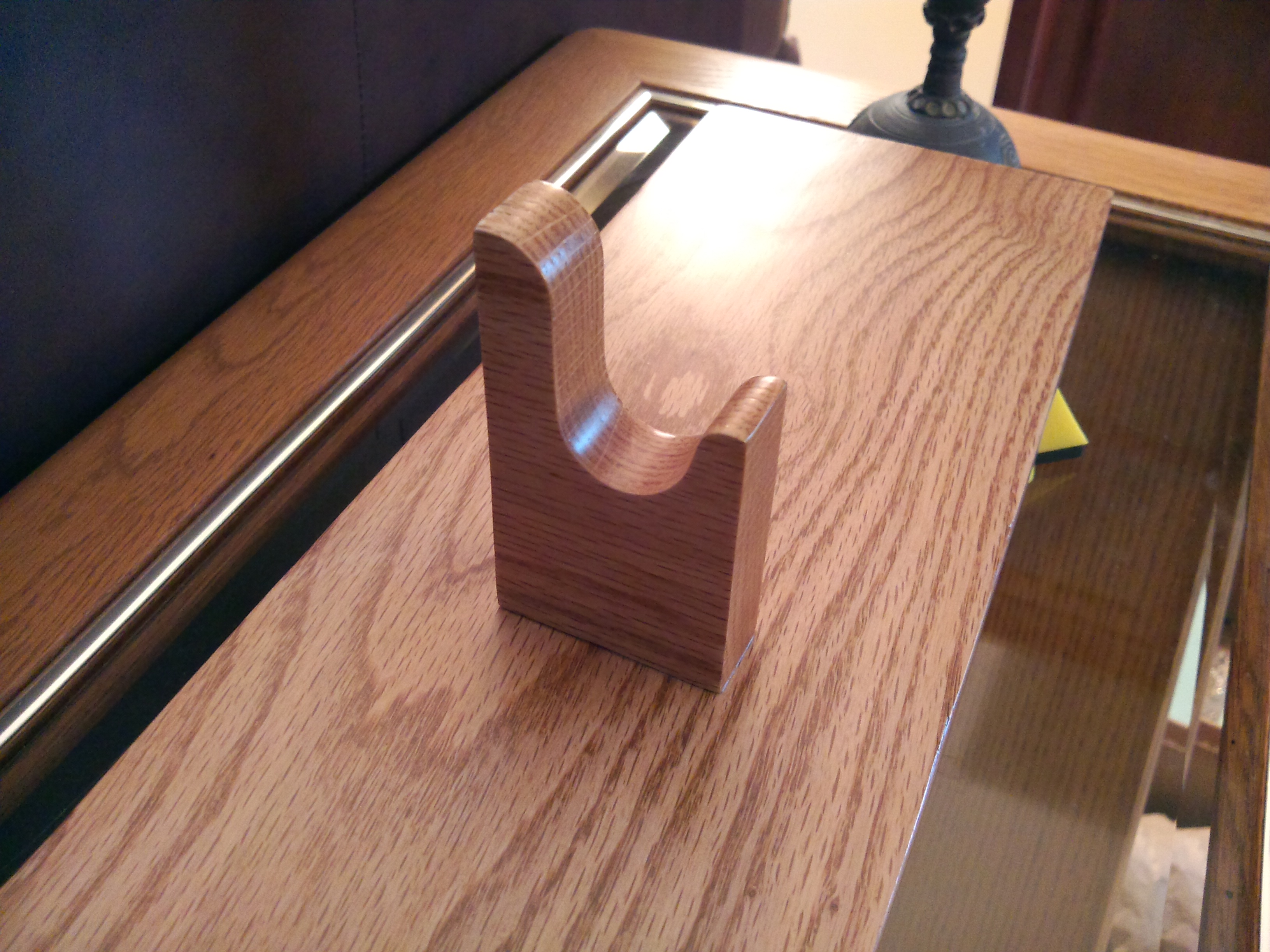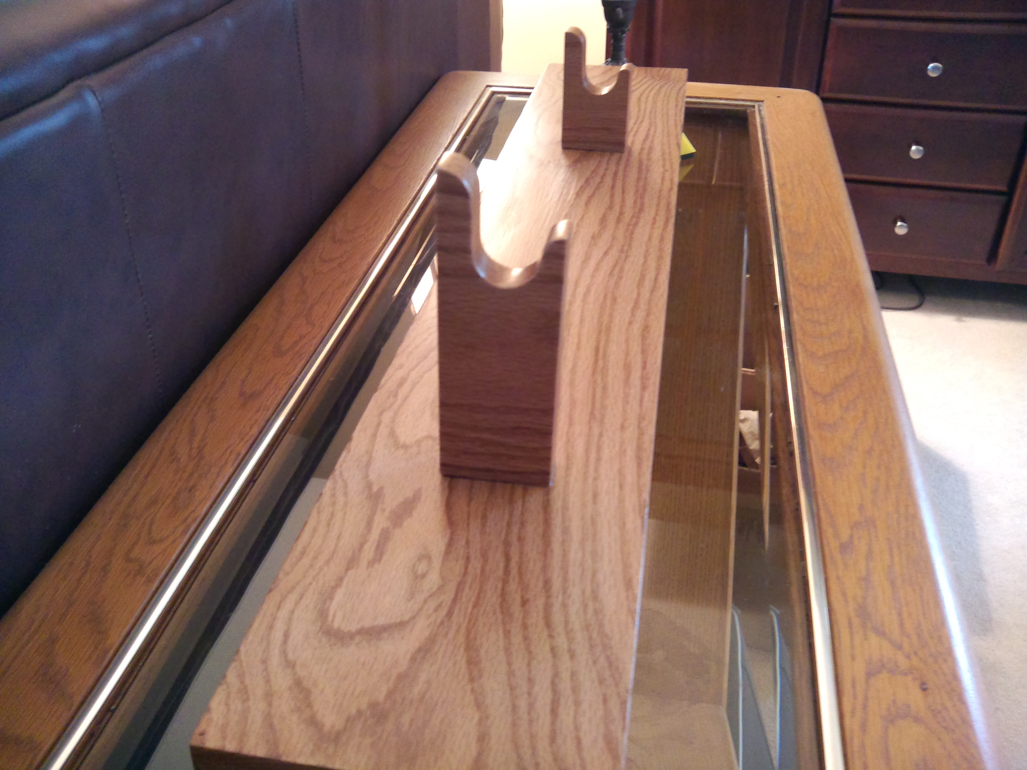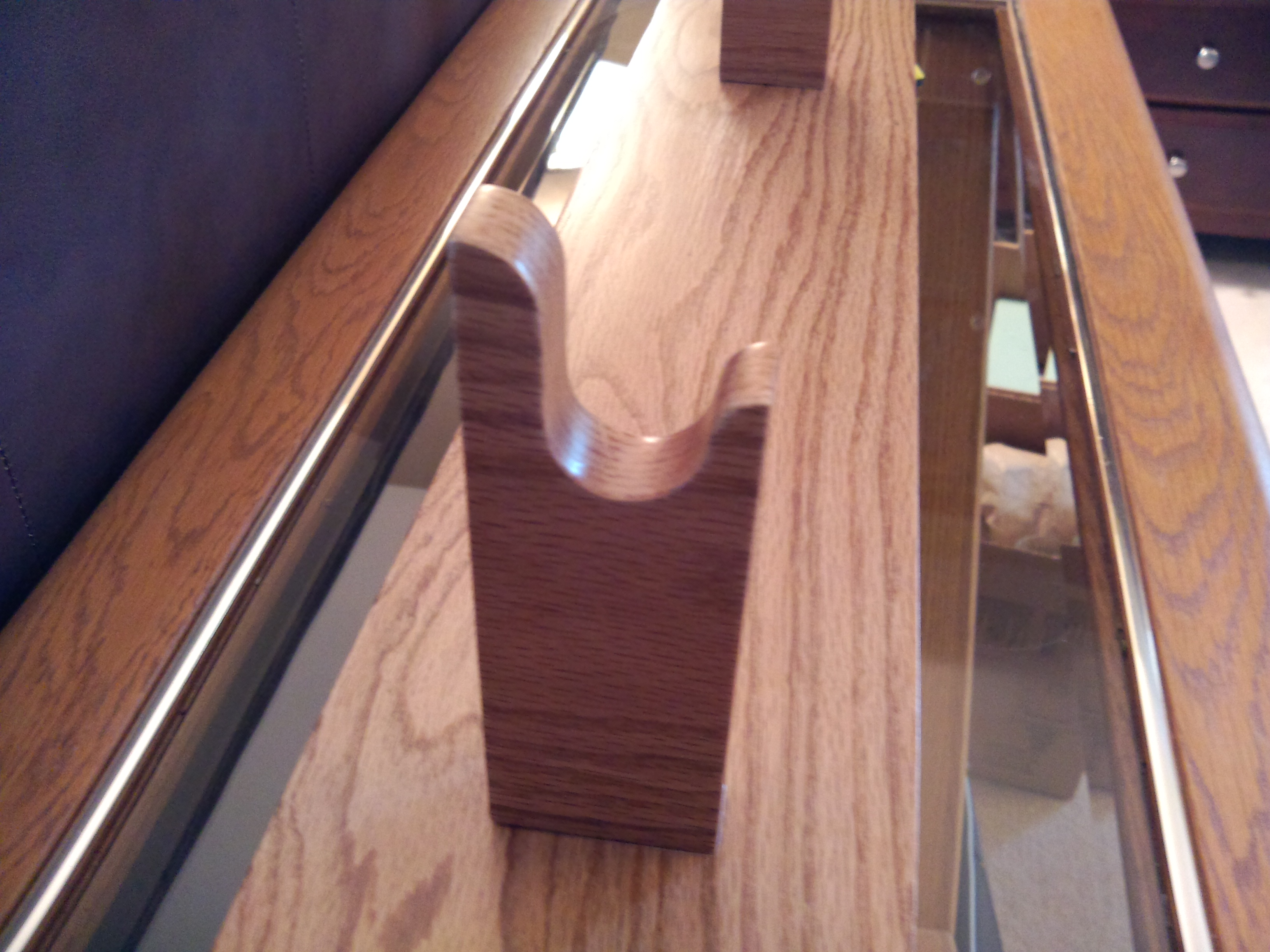 One of my colleagues from work asked me to fabricate a display stand for a presentation Ice Axe that he wanted to display. Another colleague has a similar stand that I used for a model and so made a departure from round wood for a bit to make this. I was able to use my Blade Runner to cut the saddles out of Oak and the plank itself is oak as well. My colleague wanted a cherry stain and a nice satin finish. The prototype had the saddles screwed in from the bottom of the plank and, I suppose that was OK, but I decided not to mar the bottom of this beautiful plank of oak with screw holes and used dowels to attach the saddles. The Ice Axe doesn’t weight more than a few ounces, and I suspect… I hope… the dowels with be durable enough for the long run. The piece took no time at all to make, but the finishing took several days. I used a nice product from Minwax called a Gel Stain. This went on very evenly and only took one coat. I chose not to use a sanding sealer because it is hardwood. Sanding Sealers are absolutely critical to seal the grain on softwoods for staining, but I didn’t realize that I would have a problem with raised grain in oak.
