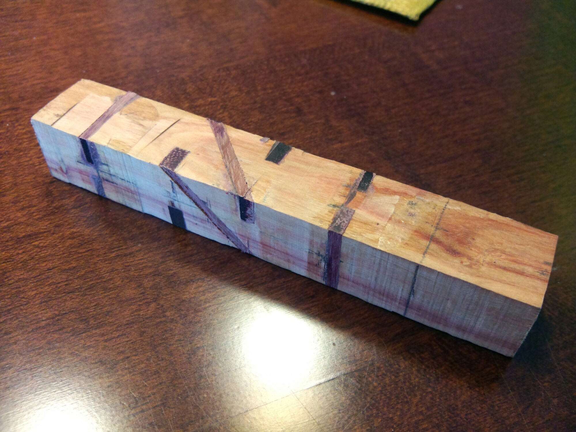 You might call this a companion to the last pen posted last week. I had seen a different segmented pen design on a forum a little while ago and Mack C posted a couple of pictures on how he created the design. I decided that, after the knot design, this would be the next one that I attempted. The straight pieces of inlay on either end of the blank were cut with my Bladerunner the same way that I cut the knot pen blank, but for the partial cuts (at the 45 degree angle) my Bladerunner wouldn’t work. So yesterday I went out to the garage, where I have my tablesaw and cleaned it up and made a little jig so that I could make repeatable cuts. This worked quite well, but the tablesaw blade has offset teeth that leave a bit of a vee cut at the depth of cut. It isn’t VERY noticable in the final product, but I would like to find a flat kerf blade. Not sure if they exist, but I think I will do some searching.