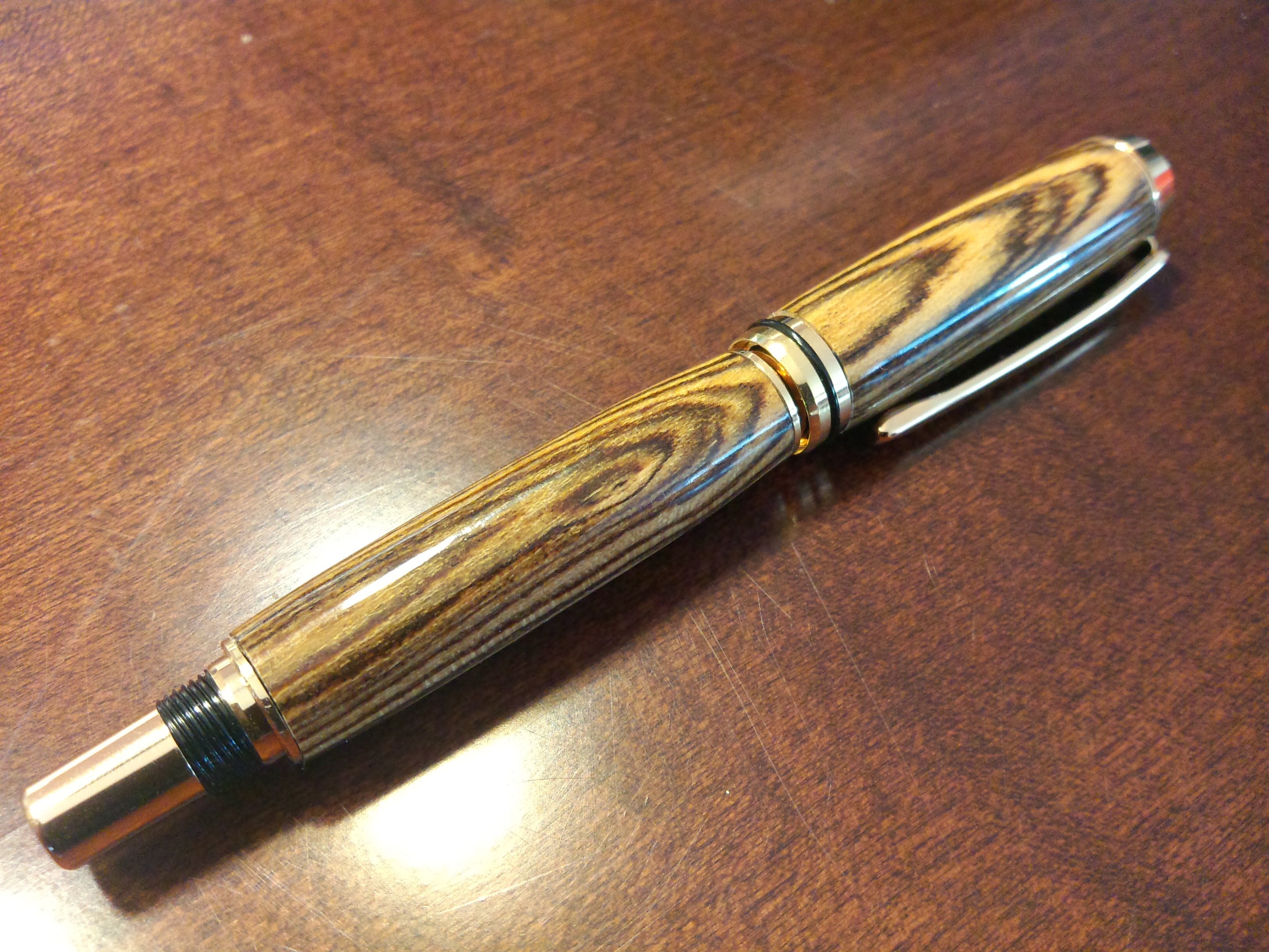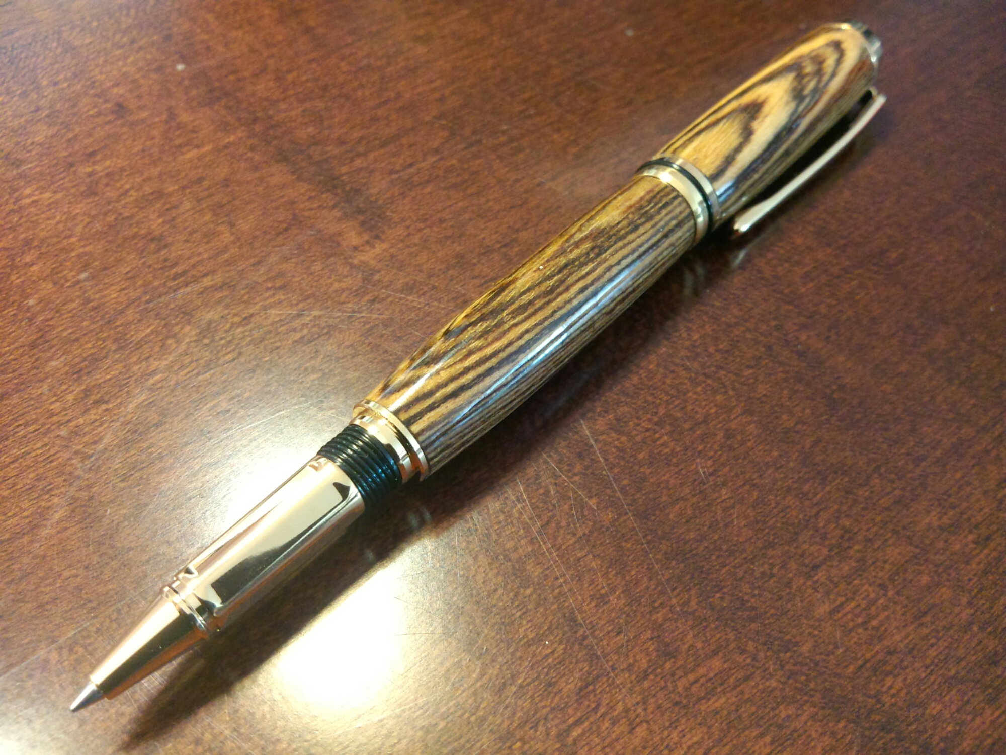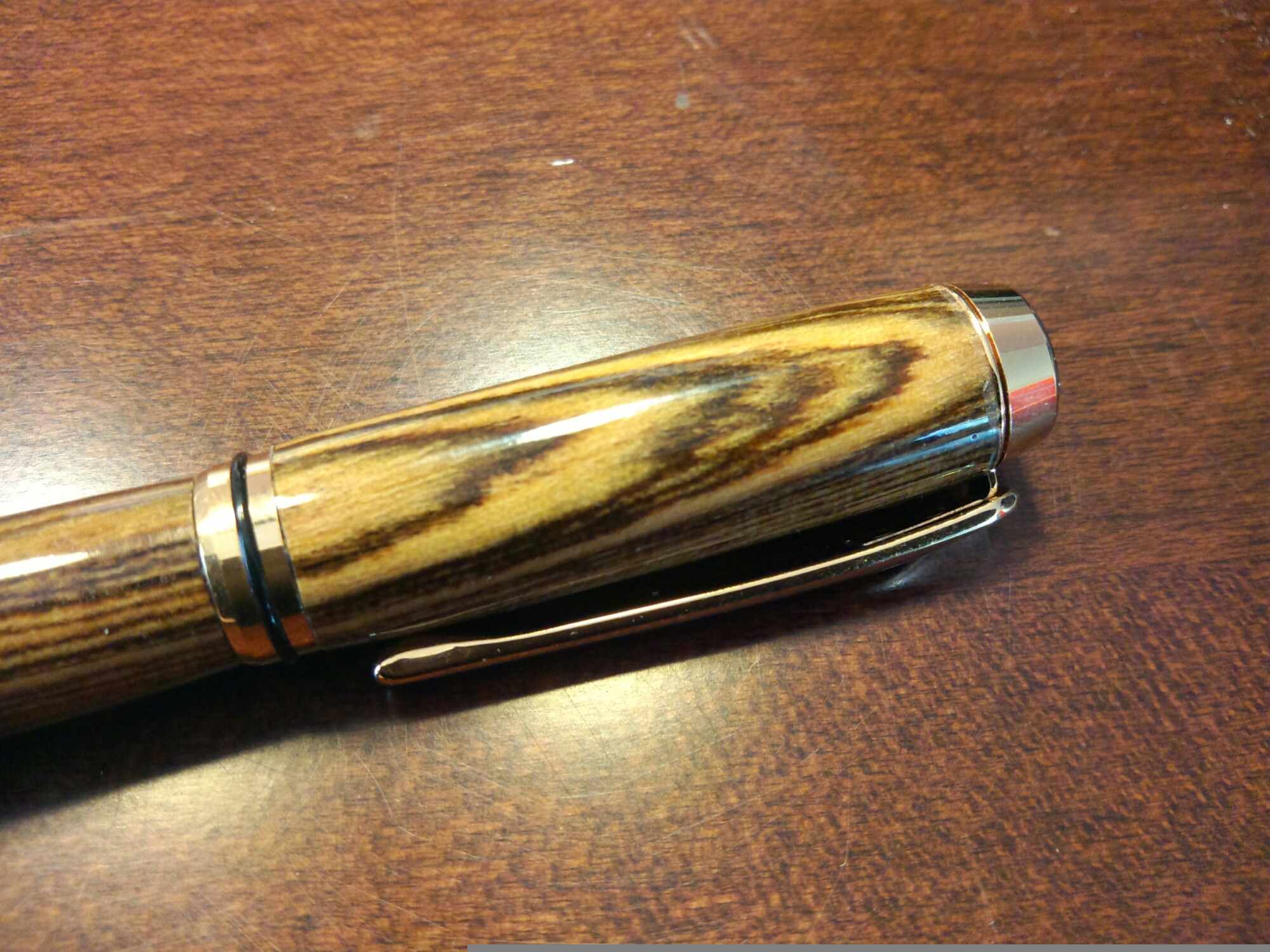 I have recently run into a friend from about 20 years ago (on Facebook). Turns out she lives just down the street from me. At any rate, she has been admiring my latest pens and asked if I could make one for her. After some questions back and forth, she decided on a Rollerball made out of Bocote. I have been playing with segmenting of late and did consider doing something on this, but with a two piece barrel, I didn’t think that a knot or “lazy s” design would look in proportion to the pen as it does in the Longwood pens. Bocote has such a strong grain pattern that I didn’t really want to detract from it. Finished in CA Glue, this pen turned out really well.