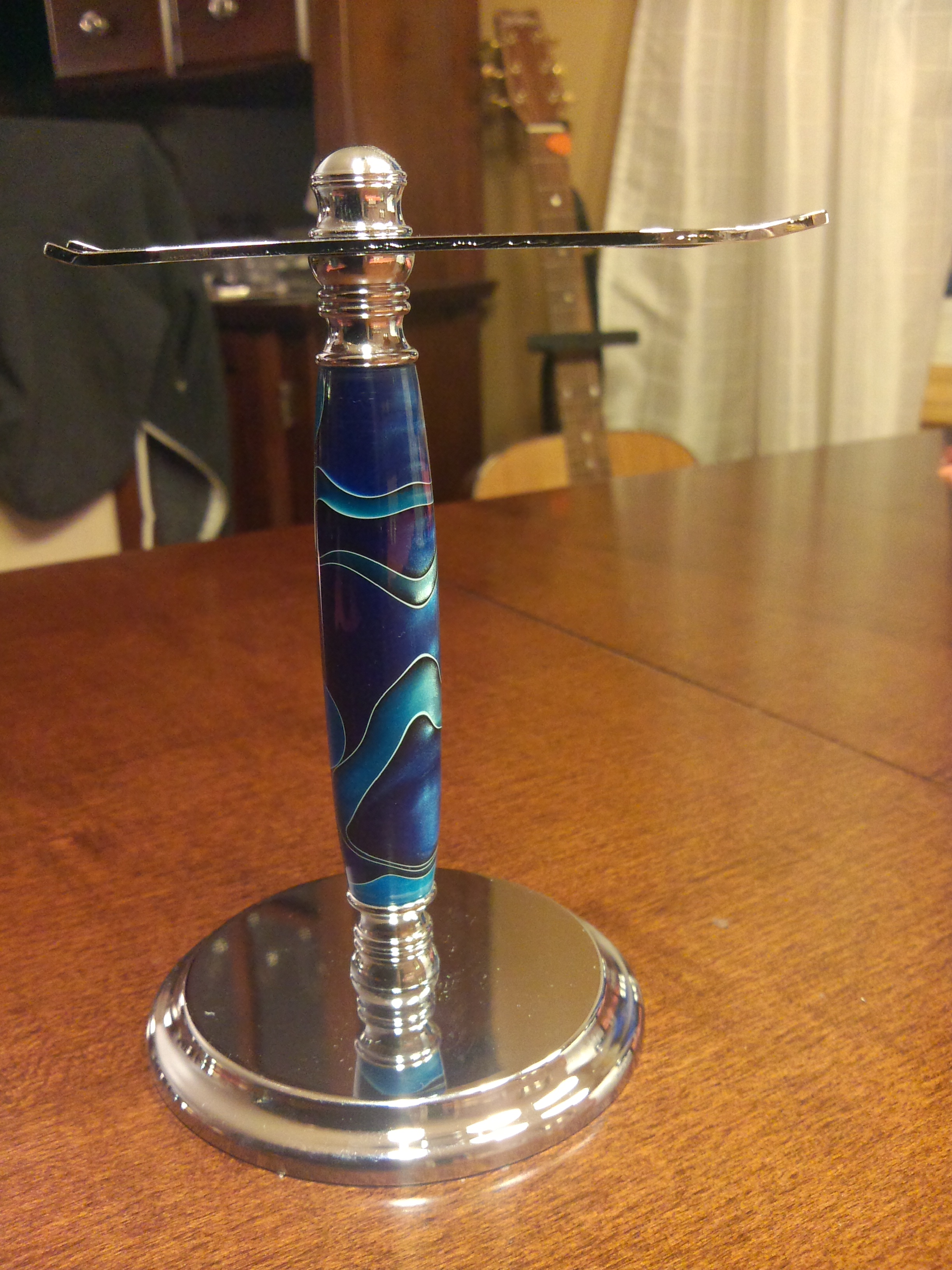 Here is the second piece to the Razor Project. Once again, I have had the stand for some time and finally decided to make it. This is also in the Acrylic “Caribbean Sea”. I also have a badger brush to make a shaving brush to hang on the other side of the stand, but am not sure where to get a blank. I wonder if I can just glue some Caribbean Sea blanks together to make a larger blank for the brush? I will have to check that out. In the mean time, my existing brush works on the stand.
