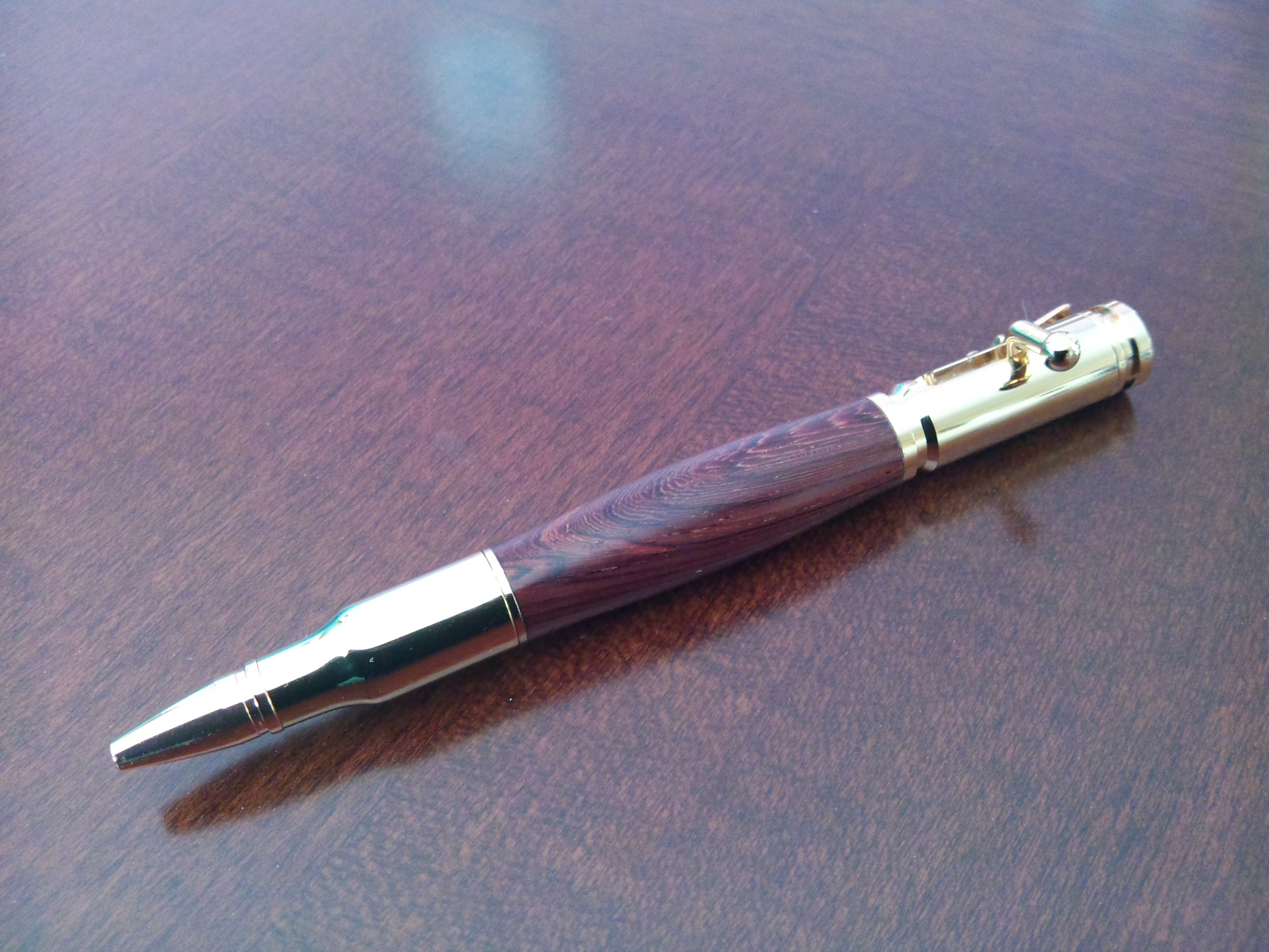 Last weekend, in the same session as my experiment with the segmented pencil, I made a “bullet” pen for a colleague. I purchased the kit in one of my first orders from Penn State Industries this spring but couldn’t decide what blank to use for the tube. I had thought deer antler or camouflage, because my friend is an avid hunter, and like me, is in the Army, but I couldn’t really find any antler and all the camouflage blanks on the market were really “cheesy”. I have it in the back of my mind that I could make a segmented blank in the Canadian Disruptive Pattern (CADPAT) camouflage, but I don’t have all of the tools to get this involved right now.
